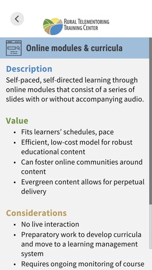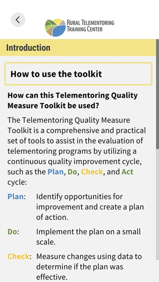 The Telementoring Quality Measure Toolkit Mobile App features resources to support the design, launch, and evaluation of telementoring programs that improve rural health. Telementoring is the use of telecommunication technology to deliver training, education, and support for health care workers. It can improve rural health by building local capacity, reducing professional isolation, improving access to care, and sharing best practices.