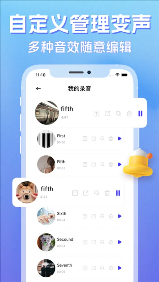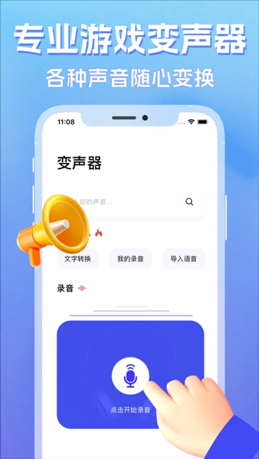 录音变声:一键开启录音,选择男声女声等音效播放,给您的声音加点特效;