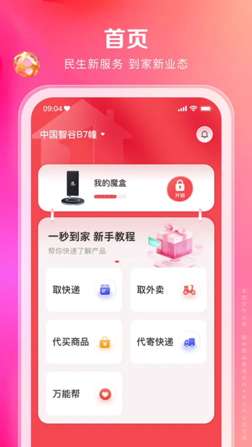 一秒到家致力于打造国内领先的万物到家智能服务平台,以社区为核心场景,以用户精准需求为导向,以智能设备为载体,联合快递企业、电商平台等大流量入口,集中社区配送最后100米订单,嫁接社区生态,构建新时代到家服务新场景。一秒到家秉持着让到家服务走进千家万户的使命,以科技和创新引领智慧社区新生活,让每一位用户都能享受到省时、省力、省心的社区到家服务。