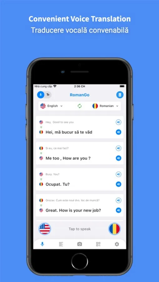 Hi ! RomanGo is the leading romanian Translator with a lot of outstanding features such as accurate voice translator, translate any text in 45 languages to romanian or romanian to any language such as: English, Korean, German, Japanese, Vietnamese, French, etc and extremely useful photo translating feature or learn romanian more easily.
