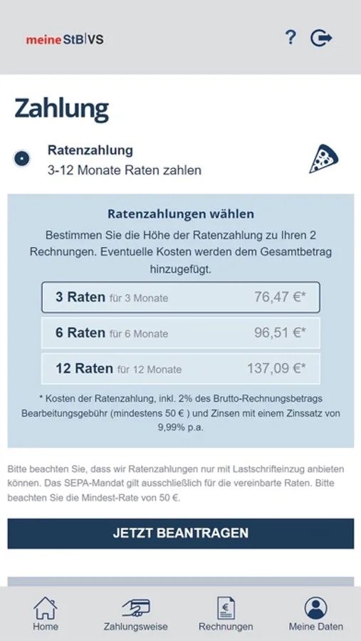 meine StBVS bietet Ihnen flexible Zahlungsmöglichkeiten und die Übersicht zu all Ihren offenen und bezahlten Rechnungen gebündelt an einem Ort. Zahlen Sie Ihre Rechnung ganz einfach und bequem per Klick, vereinbaren Sie eine Ratenzahlung oder Pausieren Ihre Zahlung. Zudem können Sie uns über die App ganz leicht und digital Rückfragen über das Kontaktformular stellen oder unter anderem Rechnungsduplikate anfordern.