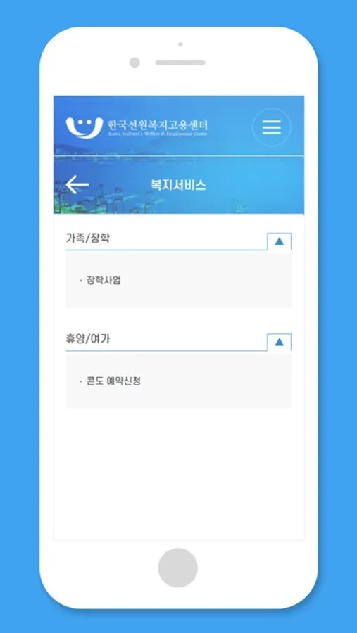- 콘도신청 : 선원과 그 가족에게 건전한 여가활용의 기회를 제공하기 위하여 전국 휴양지에 있는 콘도 시설 이용을 지원합니다.