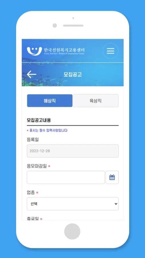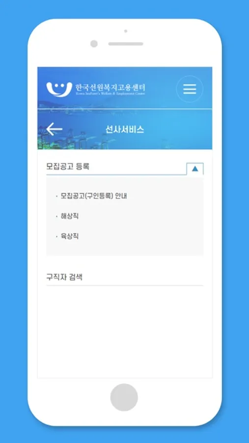- 구인등록(모집공고) : 선사는 해상직 및 육상직을 구분하여 모집공고를 내고 해당 공고에 지원한 선원들을 확인할 수 있습니다.