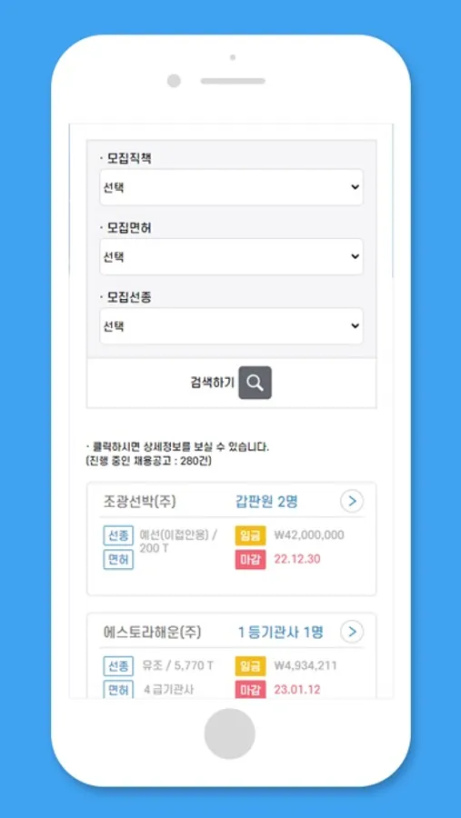 - 구인상세검색 : 선사는 구인검색정보 등록을 통하여 구직등록된 선원들을 검색 할 수 있으며 관련 이력사항 등 을 확인 할 수 있습니다.