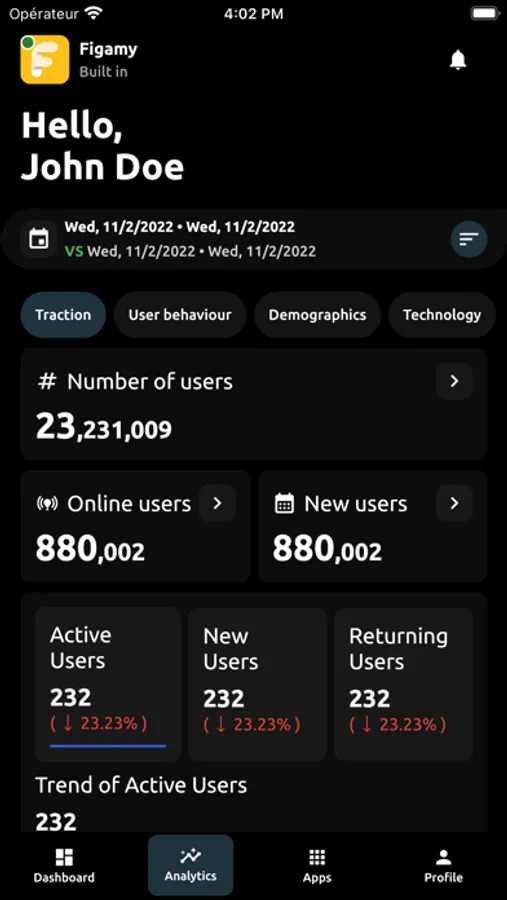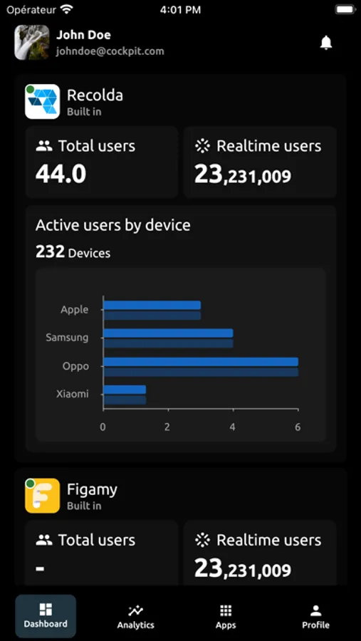 Cockpit allows you to monitor all the behaviors and analyzes of your applications developed by Diktup.