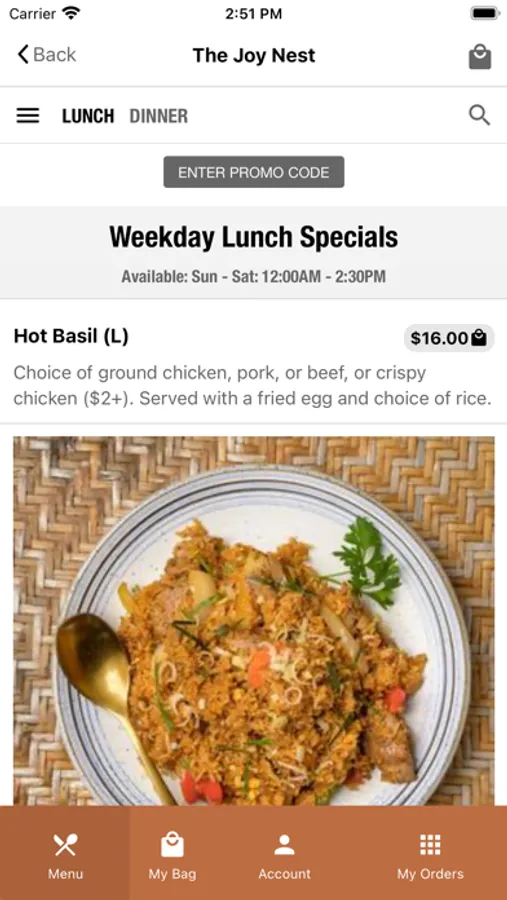 The Joy Nest offers a wide variety of Thai dishes for lunch and dinner.