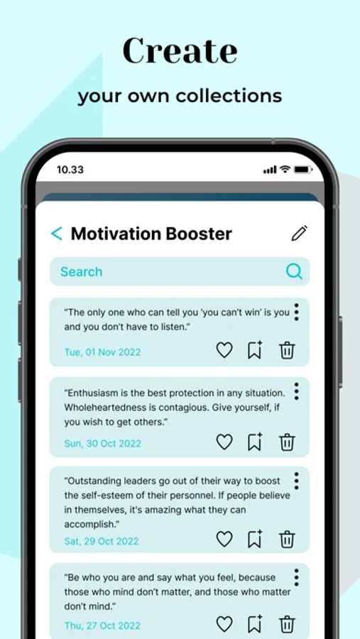 - Add Quotes to Your Collection - Create a collection of your favorite inspirational affirmations/quotes, and save them so you can access them easily whenever you want.
