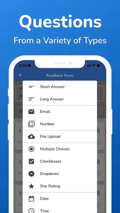 —The Questions feature supports 9 distinct question formats like Short Answer, Long Answer, Email, Number, File Upload, Multiple-choice Checkboxes, Dropdown, Date, Time, & Star Rating.