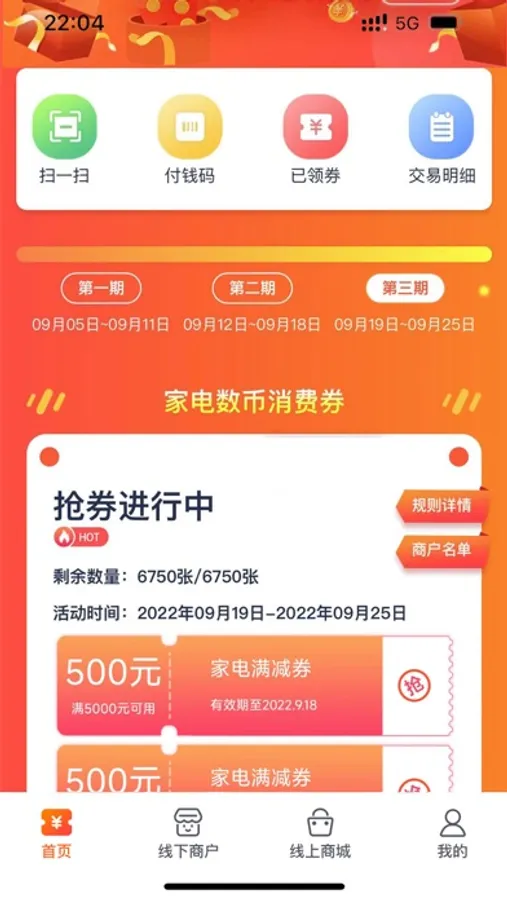 雄安新区数字人民币促消费活动官方平台。可在APP中根据规则领取家电、家具、商超、餐饮四大场景的数字人民币满减消费券,领券前需确保您已安装数字人民币APP并提前开通至少一个实名制(三类、二类或一类)数字人民币钱包,在本平台上完成实名制核验确定符合参与活动条件后即可领券。使用消费券前需根据指引完成钱包快付功能的开通,之后可在参与促消费活动的线下商户通过“扫一扫”或“付钱码”功能完成支付,支付时可选择消费券进行抵扣。