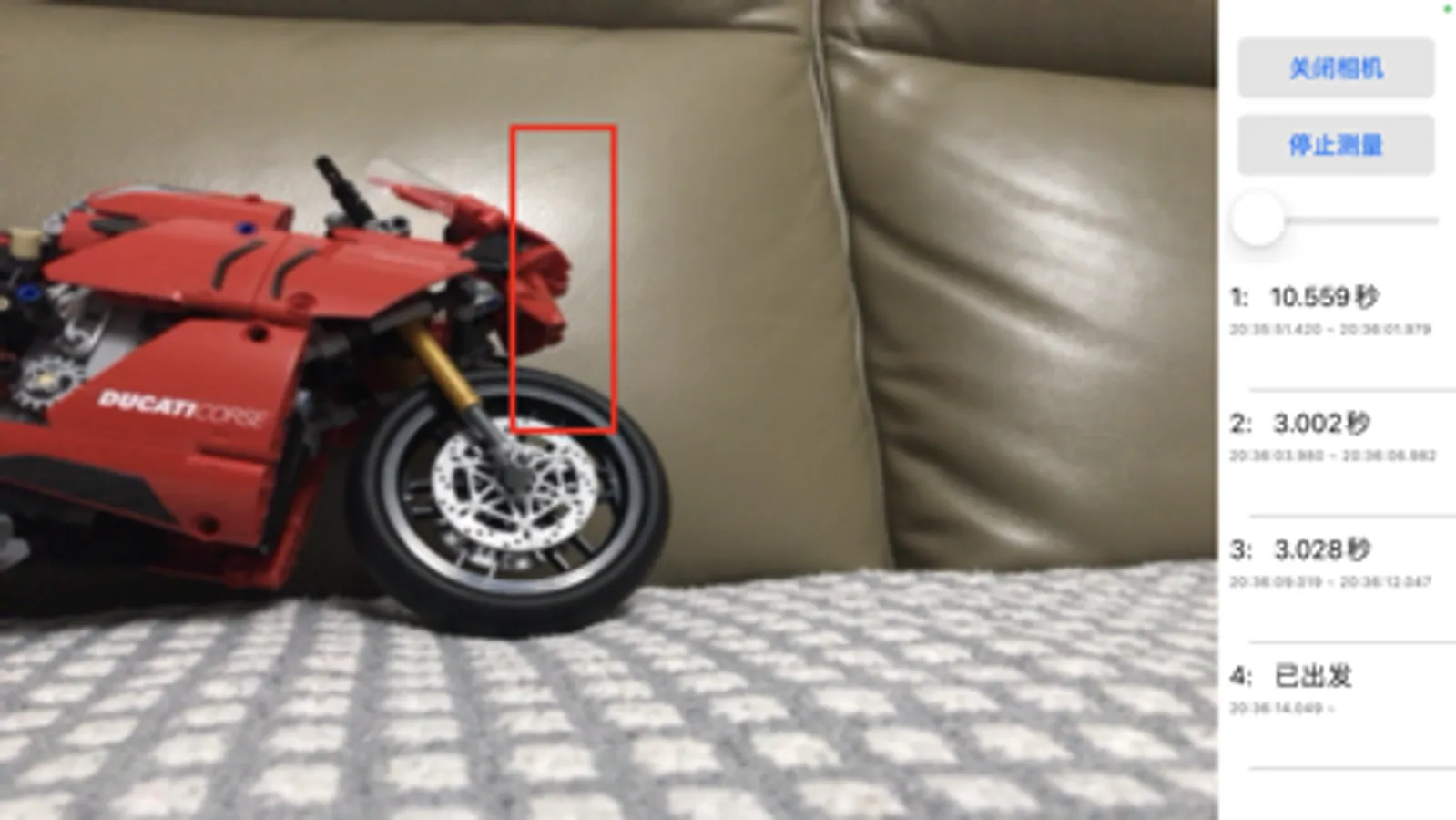 当摩托车或者其他移动物体通过标记区域发生图像改变后,系统开始计时,并发出“嘟”的发车声。当摩托车或者移动物体再次通过标记区域,触发结束,语音播报所用时间,精确到千分之一秒,并记录在屏幕上。系统计时可以反复记录,并顺序显示。