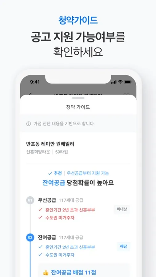 - 일반공급은 물론 특별공급(생애최초, 신혼부부, 다자녀, 노부모) 유형까지 기능을 지원해요.