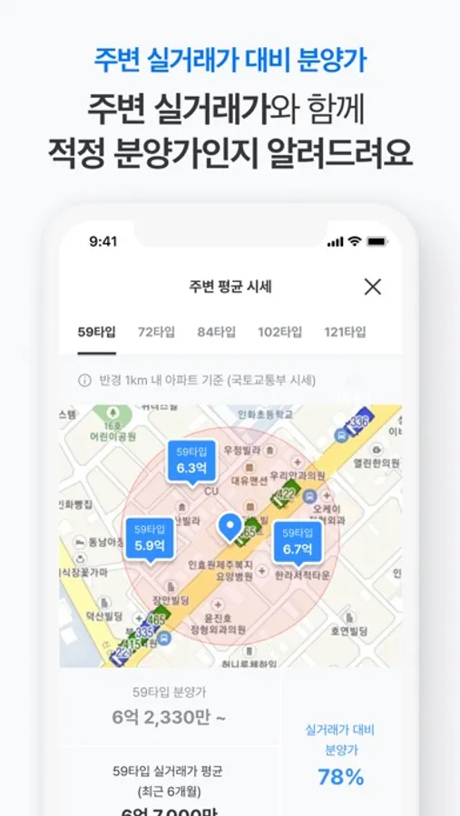 - 해당 공고의 분양가가 저렴한지, 주변 아파트 최근 실거래와 비교해서 보여드려요. 내가 원하는 타입별로 분양가를 한눈에 비교해볼 수 있어요.