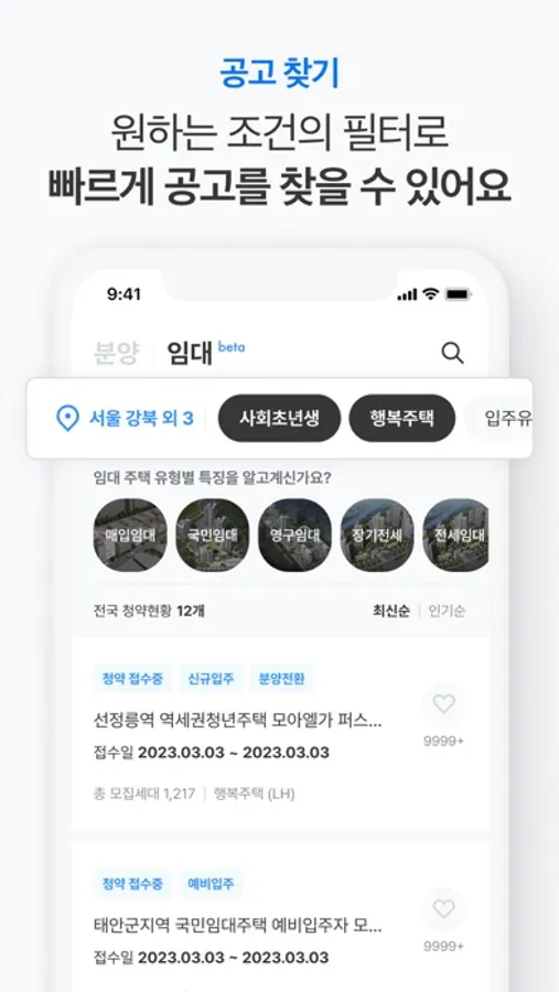 - 지역, 분양가, 선호평수, 분양상태 등 필터에 따라 원하는 조건의 모집공고를 빠르게 찾으실 수 있어요.