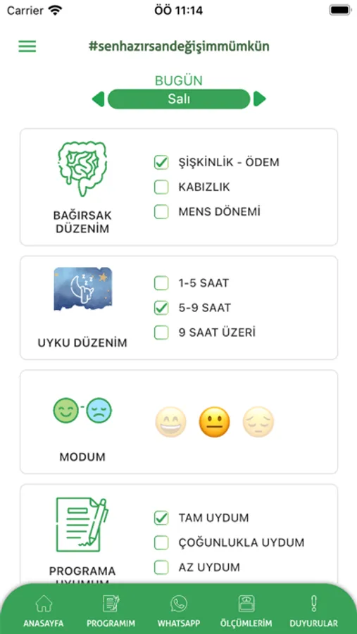 Önemli Not: Uygulamada sağlık durumlarına ilişkin olan bölümleri işaretlemeden önce doktorunuza başvurunuz. Ör: Sindirim ile ilgili probleminiz varsa ilgili alanda uzman doktorlara başvurunuz.