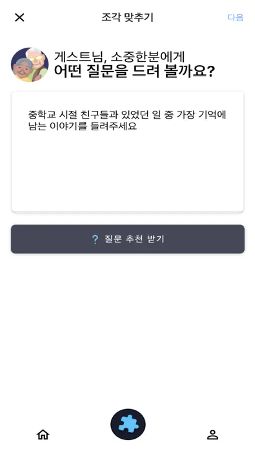추천 질문, 사진, 음성을 통해 사랑하는 사람의 이야기를 쉽게 모아 볼 수 있습니다.