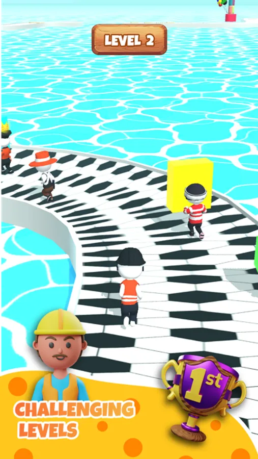The player wins the game by winning the championship at the start of the game. To guide the path, the player can pick up the blocks of wood on the road and build a bridge over the water. If the player does not have any wooden blocks to build a shore in the water park, the player will fall into the water bridge and the game will fail.