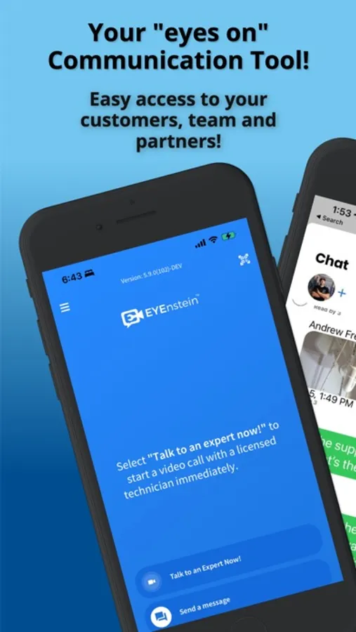 Quickly chat with a DIY Expert or scan a QR code that is given to you to instantly connect and communicate via chat or video. EYEnstein™ is being used as an "eyes on" tool for Plumbing, Electrical, Real Estate Management teams and AV Groups to easily communicate with customers and their teams.