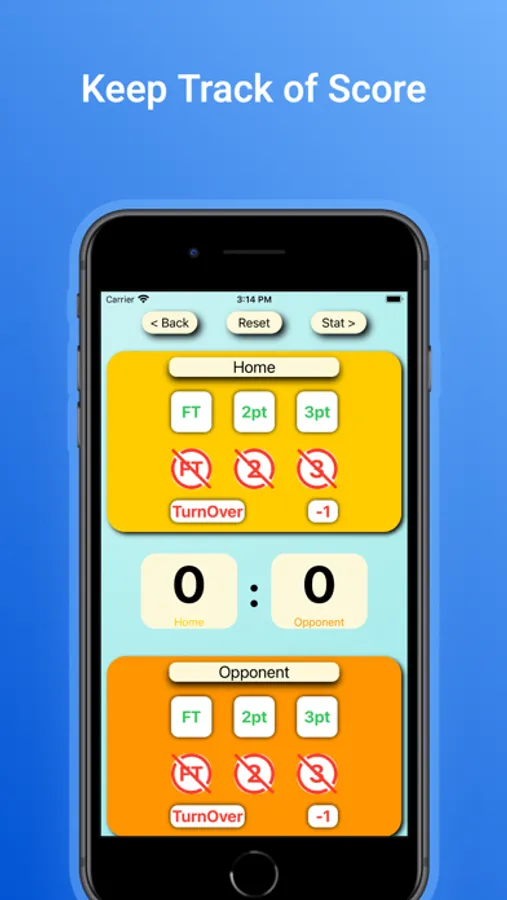 This is where score and turnover are entered. When "Track rebounds" is enabled, a separate rebound view will automatically appear after each missed shot.