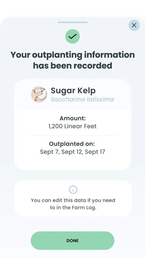 -Reports: Based on kelp biomass tracking, My Kelp calculates the estimated carbon and nitrogen removal of your farm so you can start to understand your farm’s climate impact.