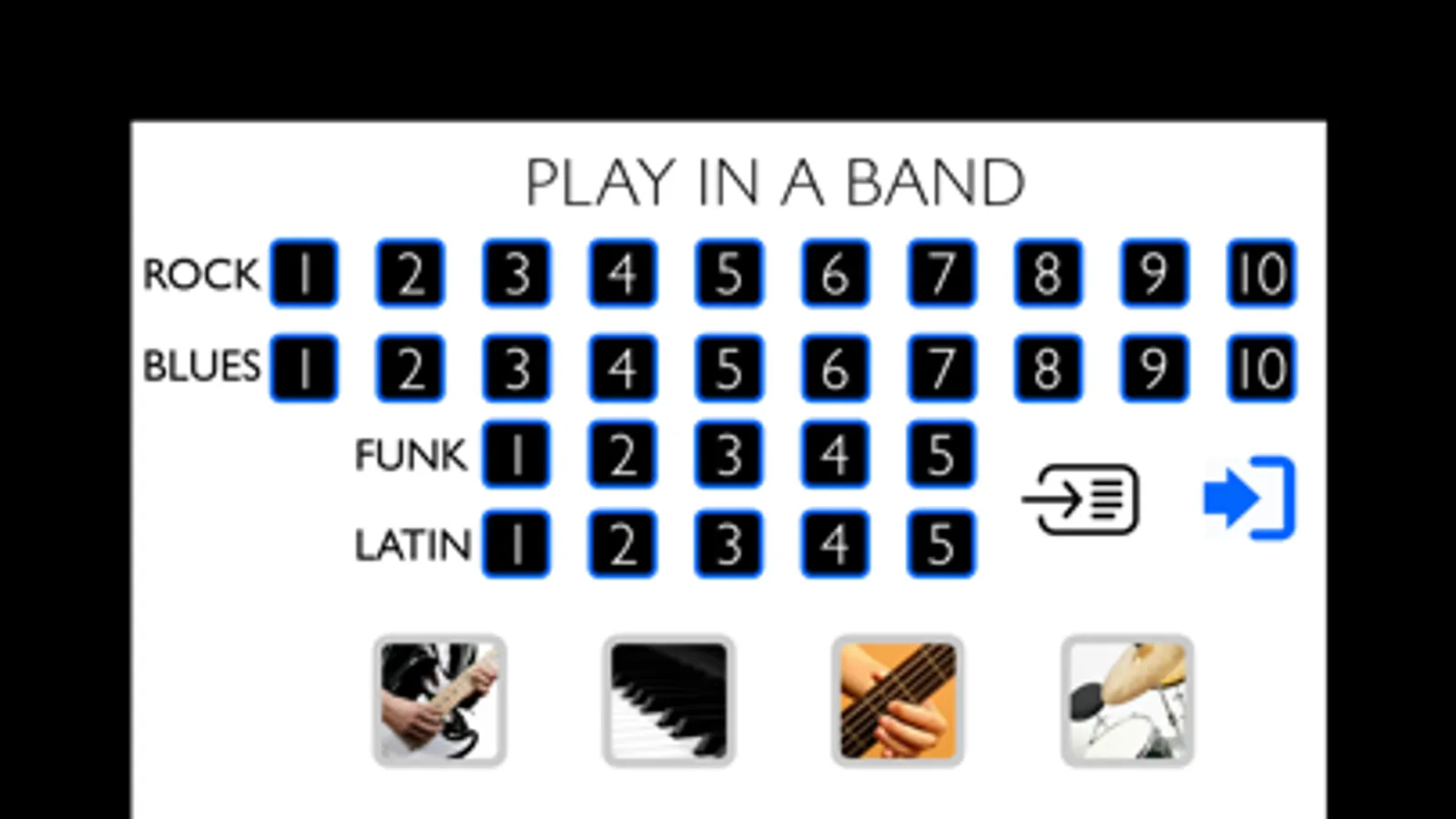 This app is useful not only for those who want to play in a band, but also for those who want to know what makes a musical style sound like it. What does a bass player have to do for something to sound like Blues or like Latin Music. What are the main rhythmic characteristics of Funk or Rock. What should a drummer do when asked to play a Blues rhythm or a Cha cha chá. How the guitar and piano/keyboard should interact, and so on. These are fundamental aspects for any musician, be it a performer, an arranger or a songwriter. The exercises in this app will help to have a clear idea of the aforementioned aspects.