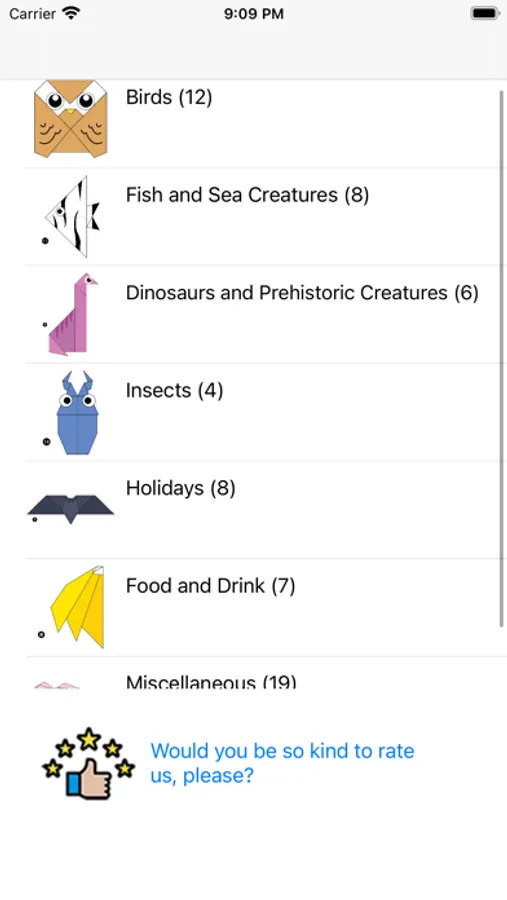 Diverse Catalog: Engage with a vast range of origami designs spanning across multiple categories. Choose from Animals, Birds, Fish and Sea Creatures, Dinosaurs and Prehistoric Creatures, Insects, Holidays, Food and Drink, and Miscellaneous. There's a masterpiece waiting for every origami lover!