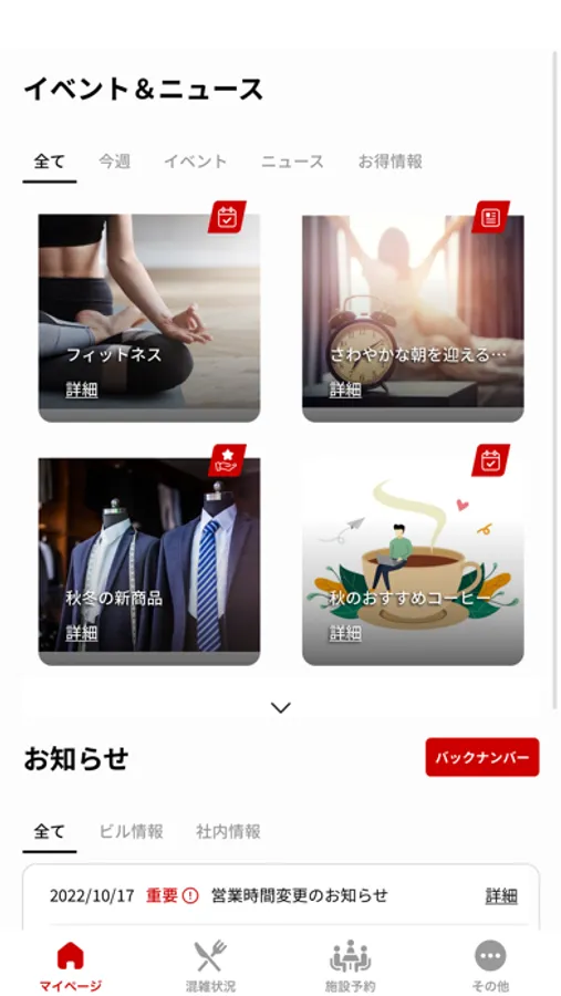 ビル管理及び所属テナントから配信される各種イベント&ニュースを閲覧することができます。