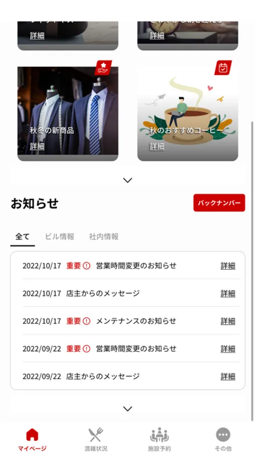 ビル管理及び所属テナントから配信されるお知らせを閲覧することができます。