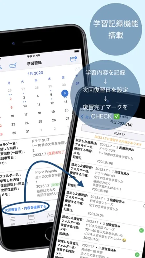 カレンダーを利用して、学習内容や復習回数、次回復習日などの設定が可能