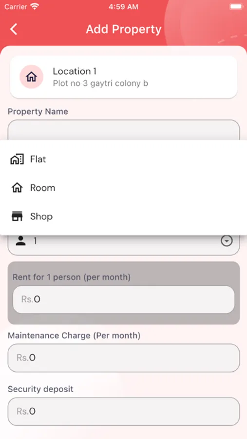 In this app, an owner can save multiple properties in different locations. Property can be of following types: