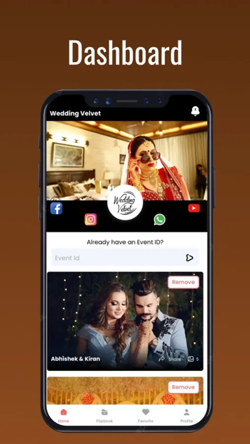 Just Enter the Event ID on the App to follow the Event. Share selected photos to Social Media networks. You can also share the Event ID with your Friends and Family, even the ones who couldn’t make it to the Event.