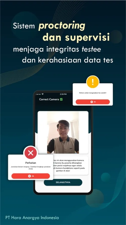 Sistem kami dilengkapi dengan fasilitas login kredensial dan pengawasan secara realtime yang dapat mengirimkan peringatan untuk kandidat, serta berkomunikasi dengan admin untuk menyampaikan informasi tentang proses ujian online. Dengan sistem pengawasan langsung ini kita dapat melihat masalah yang terjadi selama tes dengan segera.