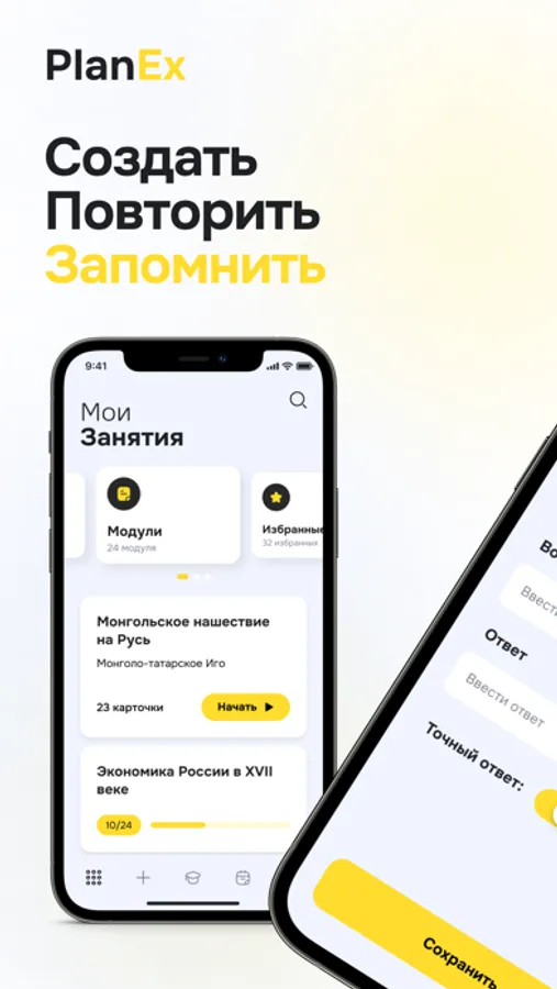 Учиться и закреплять полученные знания с PlanEx очень просто: заполните карточки, а дальше приложение само определит, когда и какую информацию вам нужно повторять. Умный календарь рассчитает необходимое для освоения материала время и пришлет уведомления о карточках, готовых к повторению.
