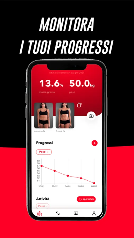 Avrai sempre sotto controllo la tua attività fisica: potrai visualizzare quali esercizi sono previsti nel tuo piano di allenamento, i tuoi progressi e come cambia il tuo fisico nel corso del tempo.