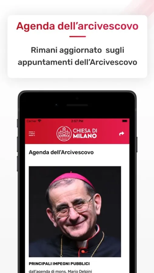 La app “Chiesa di Milano” consente un accesso immediato alle principali informazioni relative alla Diocesi ambrosiana: il magistero dell’Arcivescovo, mons. Mario Delpini, e l’agenda dei suoi impegni pubblici, i riferimenti dei diversi vicariati e uffici di Curia, le informazioni basilari sulle 1.107 parrocchie, i comunicati stampa e le news più recenti, le gallerie fotografiche, i video e le foto degli eventi diocesani.