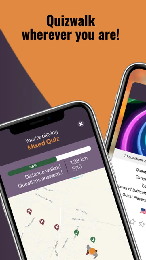 The app for digital quizwalks! Combines physical movement with entertaining quizzes as questions appear on the screen as you go - perfect as an outdoor activity for schools, corporations, birthday parties, or peronal use. Challenge yourself in general education and trivia or shape your own content. Create your own quizzes, or choose ready-made ones from the quiz bank. The app requires the user to move around for the questions to appear in order to reduce sedentary behavior - Go Walk Yourself Smarter!