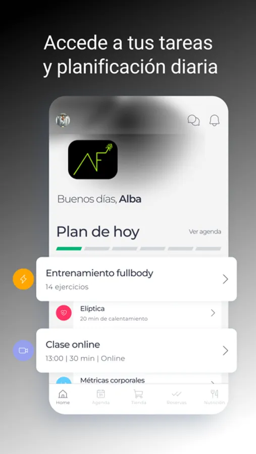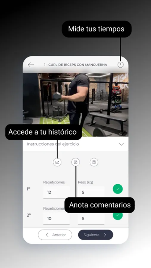 Todo ello de forma personalizada e individualizada para ti por tu profesional a través de la App. Además, comparte con él/ella en tiempo real todos tus resultados para que pueda ayudarte a evolucionar y crecer de manera rápida y eficiente.