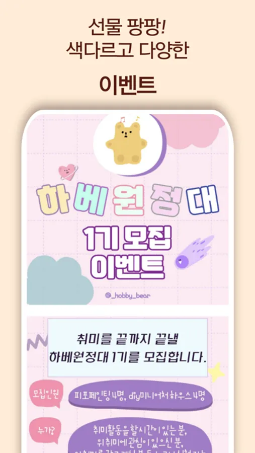 하비베어는 DIY 취미를 여러사람들과 공유하고 즐기는 공간입니다. 다양한 이벤트에 참여해서 포인트도 받고 다양한 경품도 받아가세요. 취미를 지원해드립니다.