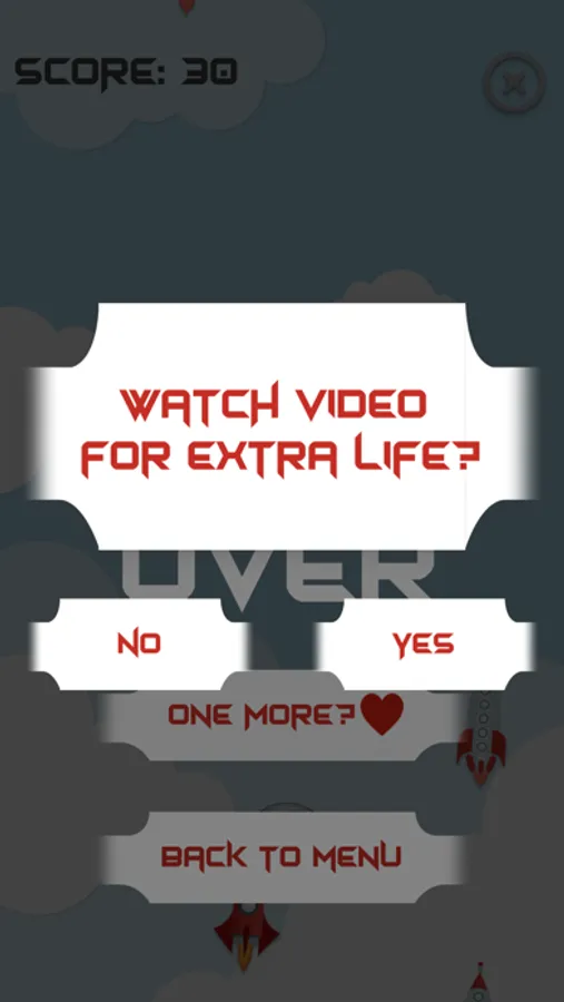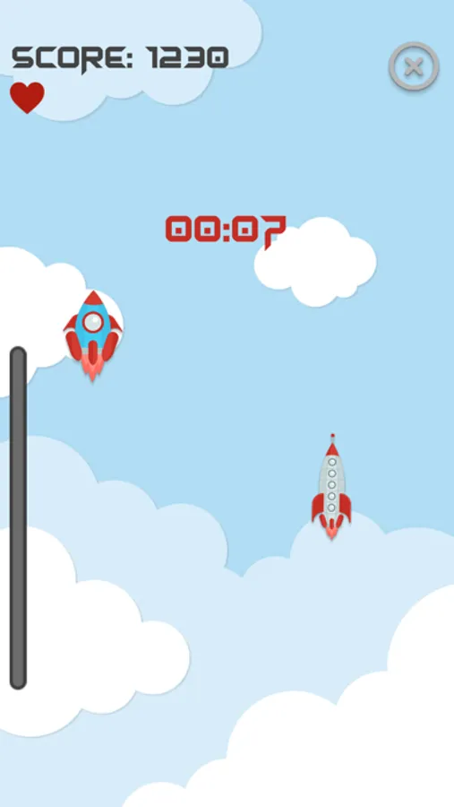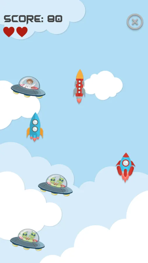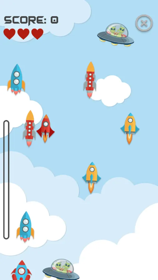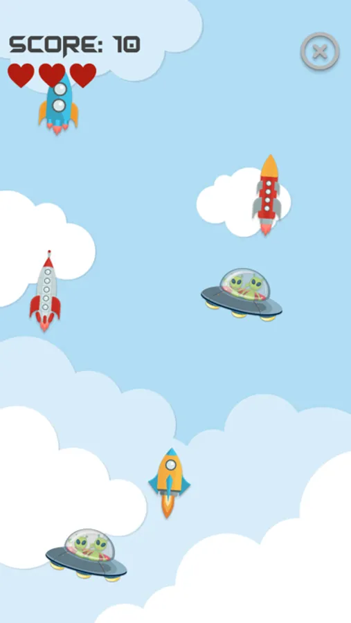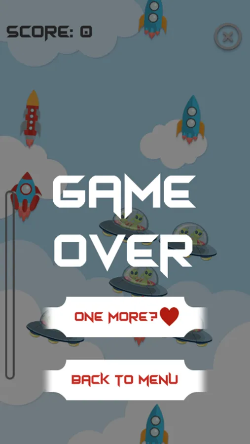 FLY – tap the rockets and the rockets only, be careful because you lose a life when you tap on the alien spaceship. When you fill up the experience points bar, you get a bonus game. This is where you should tap the space rockets quickly and earn more points! Turn sound effects and background music on/off in settings.