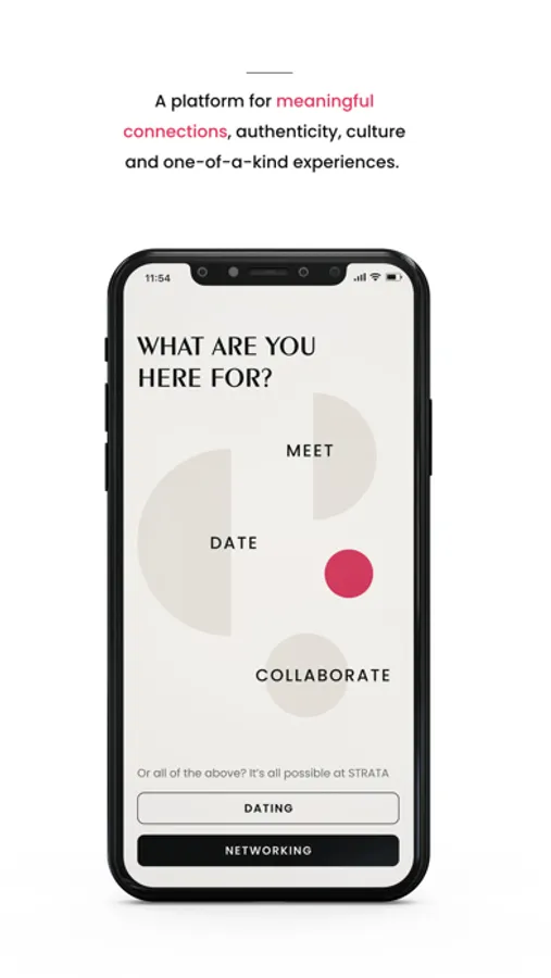 STRATA is a private, membership-based, networking app., STRATA can be used for romantic, platonic, and occupational purposes. We curate our membership based on your impact and influence in your occupation, and/or to the community. STRATA has an eligibility criteria that takes into consideration an applicants’ socials (IG, LinkedIn), existing Member referrals, and the impact you have made in the community and/or occupation.