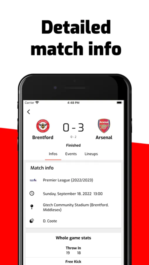 Receive real-time push notifications for various events including game starts and ends, halftime updates, goals, cards, and substitutions.