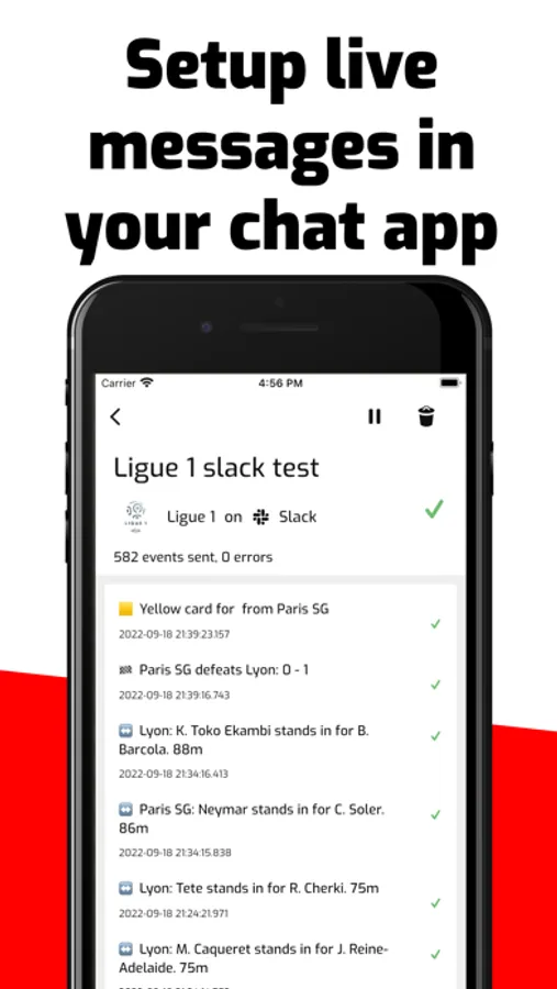 Follow the action closely with real-time push notifications for every event during a game. Experience the exclusive feature of receiving live game events in your favorite messaging app. Try it out and enhance your football live action!