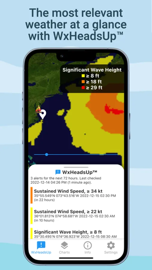 Weathermuffin is the first weather app specifically tailored to mariners which considers your specific circumstances. With the novel WxHeadsUp™ active monitoring feature, Weathermuffin proactively tells you what conditions to look out for.