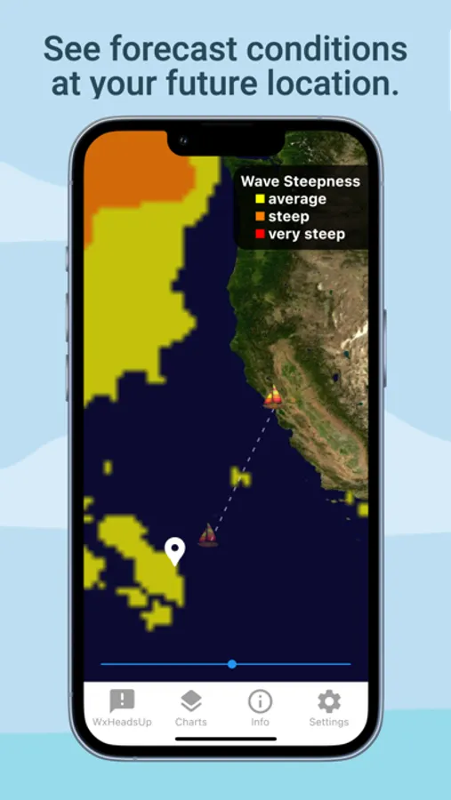 • See forecast conditions at your future location. Easily move forward and backward in time to see the weather in context with your anticipated position.