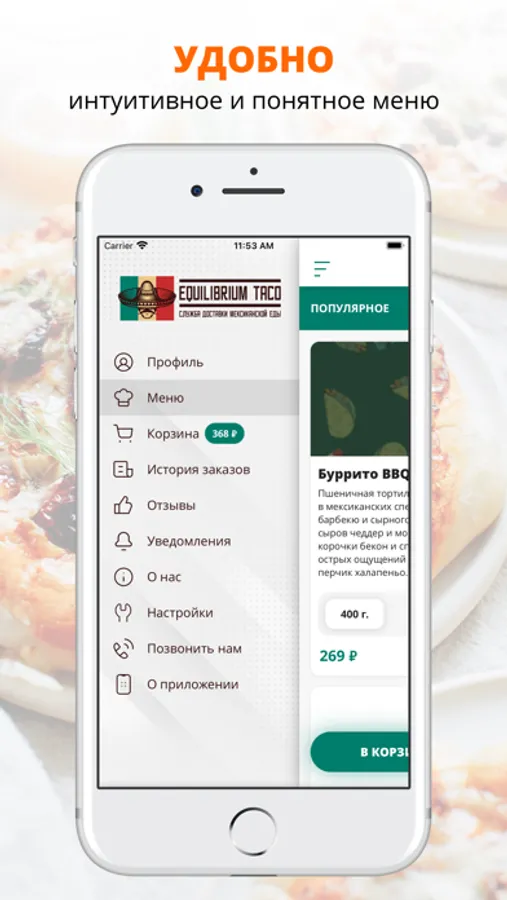 Приложение Equilibrium Taco — это удобный способ заказа еды домой или в офис! Мы готовим наши блюда из качественных свежих ингредиентов и доставляем еду по Новосибирску быстро и бережно.