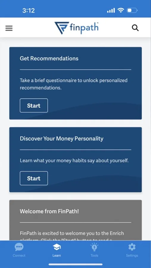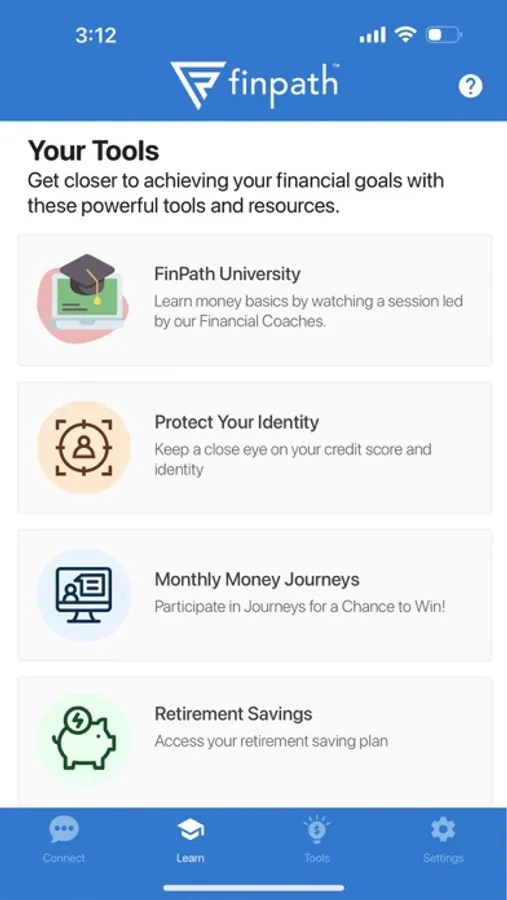 Go from surviving to thriving with personalized financial tools and resources provided by FinPath Wellness! Choose from hundreds of interactive courses and 30+ online tools offered in the dashboard, and schedule unlimited sessions with a certified Financial Coach. With all this at no extra cost to you, financial freedom is just a click away.
