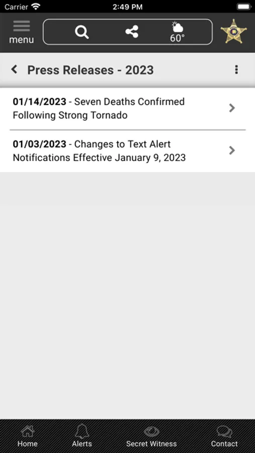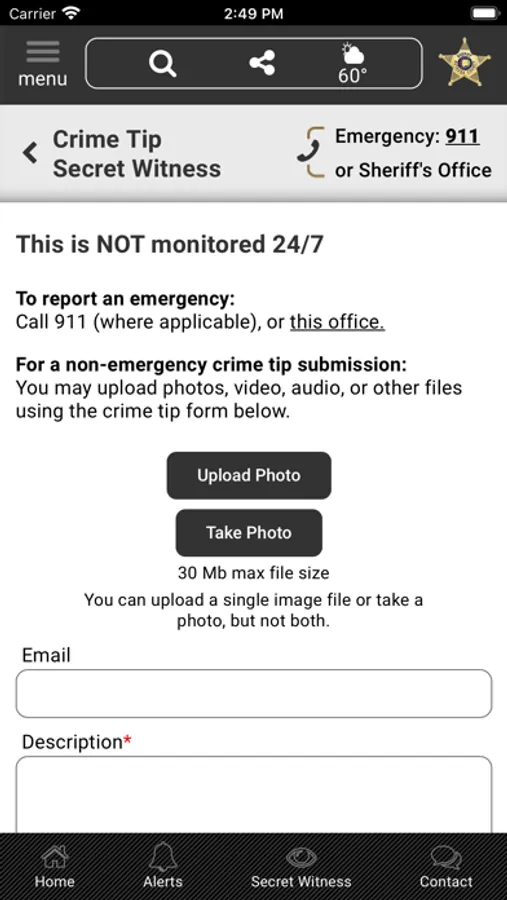 The app has public information for press releases, inmates, most wanted, sex offenders, special alerts, and FAQ's. Crime tips and contact us messages can be sent to the S.O.