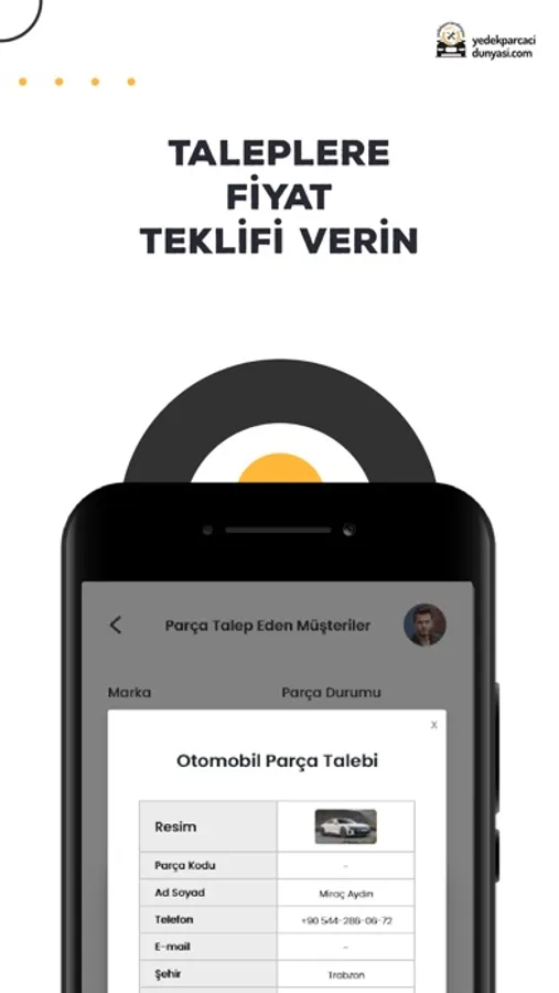 O zaman Yedek Parçacı Dünyası'nı indirin ; benzersiz olan '' Yedek Parça Talebi '' bölümümüzden aracınızın bilgilerini , aradığınız yedek parçanın bilgilerini ve iletişim bilgilerinizi doldurun. Bayilerimiz size ulaşsın ; fiyat , stok ve uyumluluk bilgisi versin. Gelen teklifler arasından size en uygun tercihi yapın , hem sıfır hem de ikinci el yedek parçaları güvenle satın alın . Üstelik hızlı , basit ve ücretsiz !