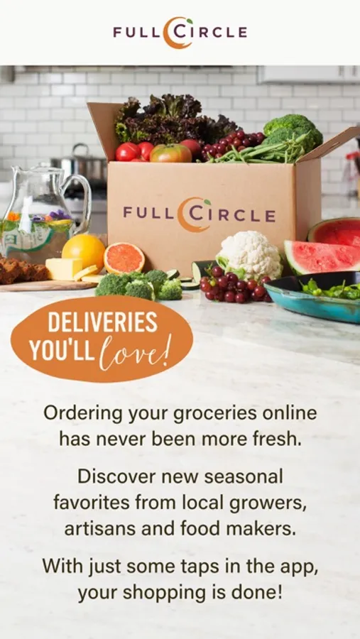 {Limited delivery areas} Full Circle delivers fresh, organic produce and artisan groceries to homes, offices and pick-up locations in areas of Washington, Oregon, Idaho and Alaska. Each delivery is 100% customizable with the seasonal produce you enjoy most, natural grocery staples and artisan farm products.
