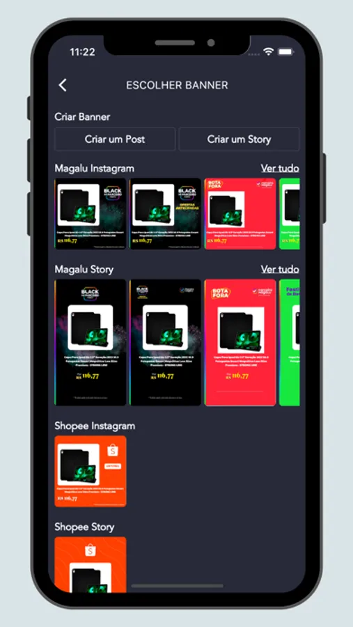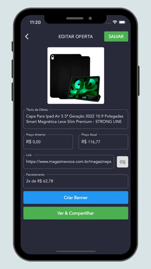 Com o nosso aplicativo, criar ofertas nunca foi tão fácil e rápido! Seja para o Influenciador Magalu ou outras lojas, você pode criar ofertas personalizadas com apenas alguns cliques ou até mesmo buscar ofertas através de códigos de produtos. E o melhor de tudo é que você pode editar os banners do jeito que preferir, deixando as suas ofertas ainda mais atraentes e chamativas.