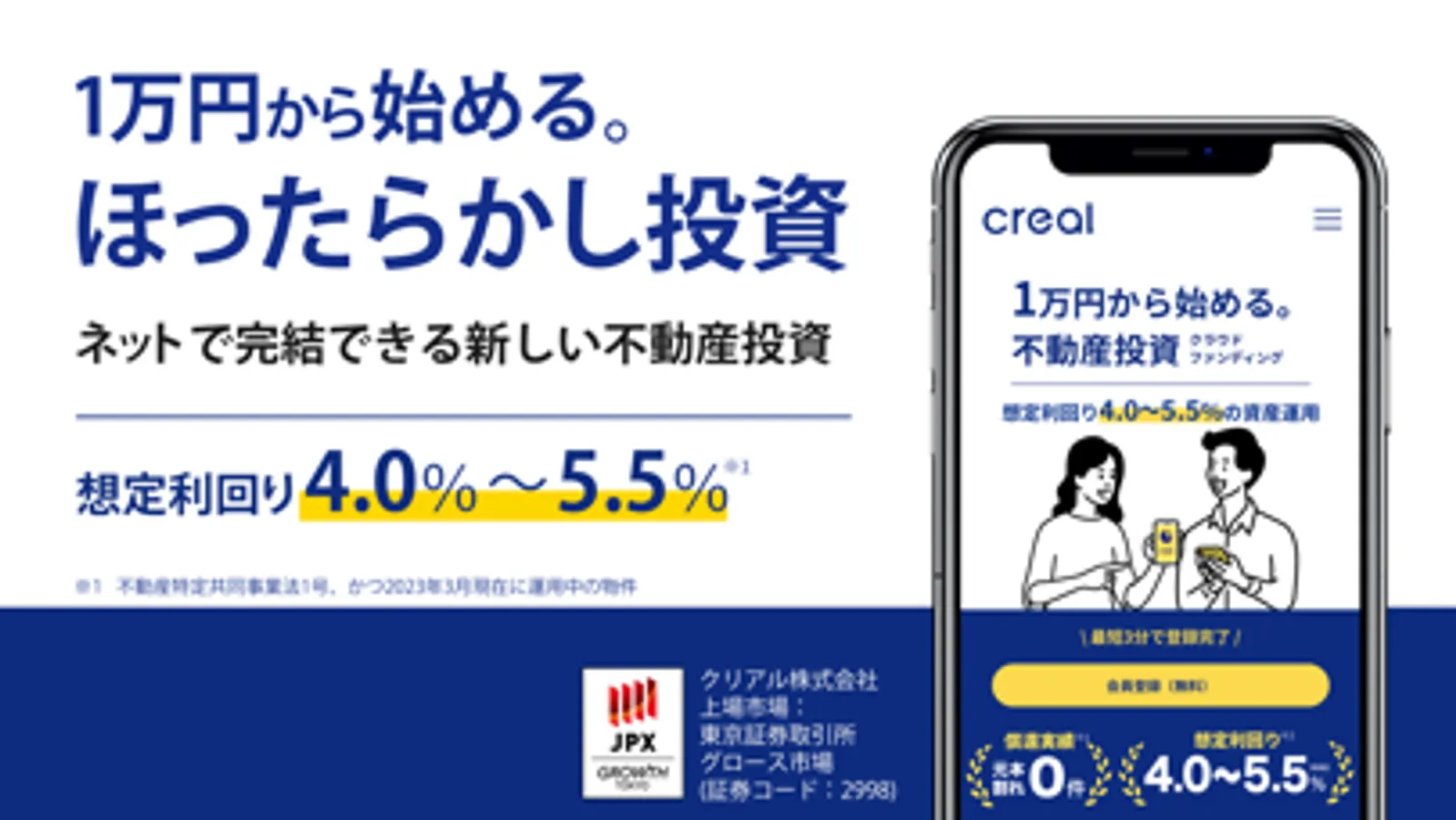 弊社は、不動産アセットマネジメント会社で、東京証券取引所グロース市場に上場しています。CREALは、不動産投資業界で実績のある私たちが厳選した資産価値の高い物件のみを掲載しており、現時点*2での元本割れはございません。